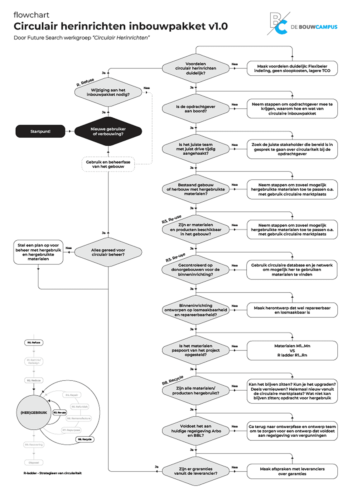 Iedereen die verantwoordelijk is voor het beheer van één of meerdere gebouwen zou de Flowchart Circulaire Herinrichting standaard op zijn bureau moeten hebben liggen. Dat stellen Leo Oosterveen (De Bouwcampus) en Atze Boerstra (TU Delft). Samen met andere belanghebbenden uit de keten, zoals architecten, leveranciers en opdrachtgevers, ontwikkelden zij deze praktische tool als actielijn 4.
